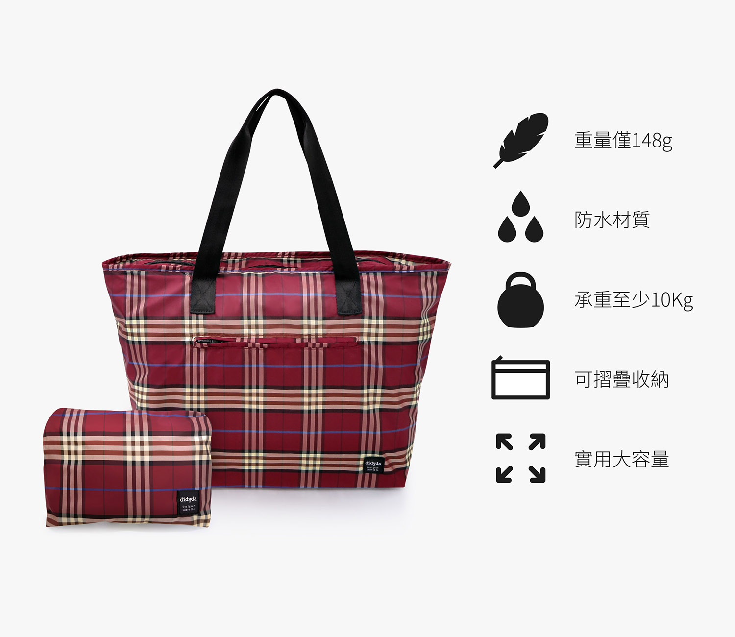 重量僅148g,輕薄柔軟卻強韌的布料材質,不用擔心袋身過重,讓人隨時出發的輕盈感。